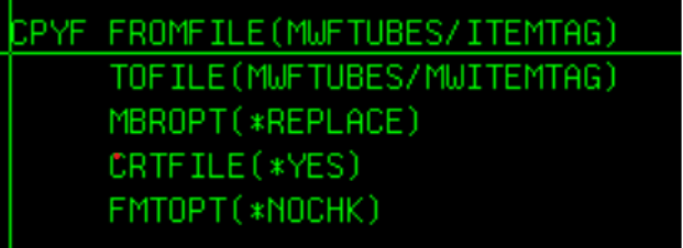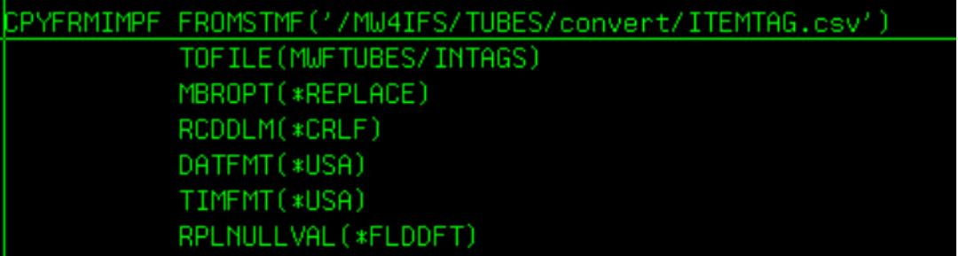 CALL MODTUBES/TAGSINCL will execute the CPYFROMIMPF command to copy the csv file to Intags file.